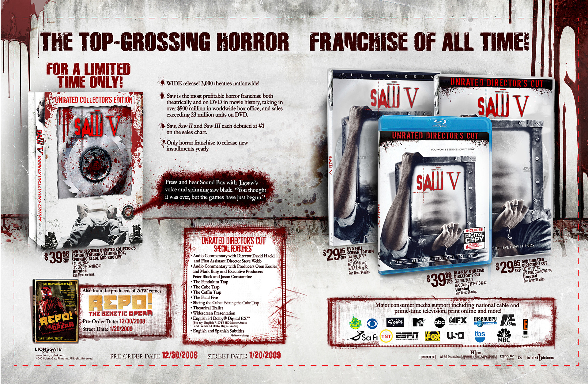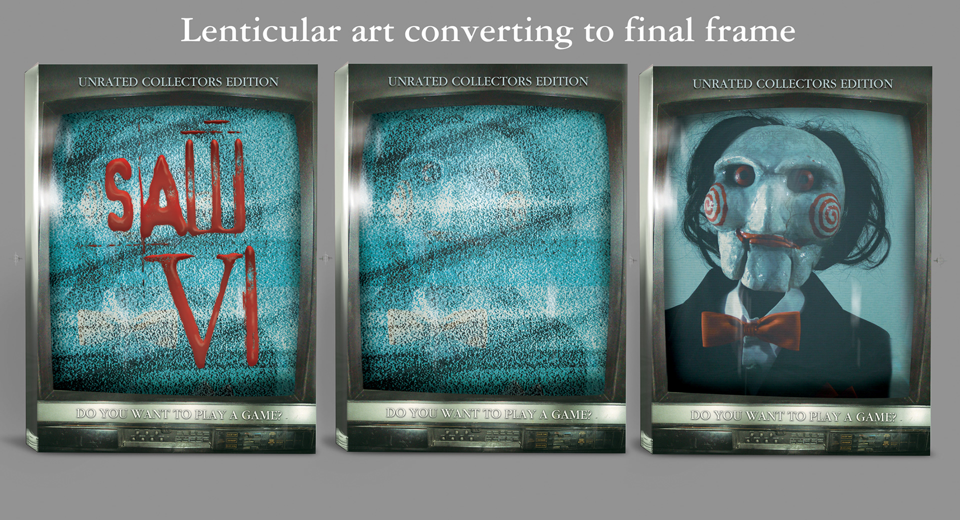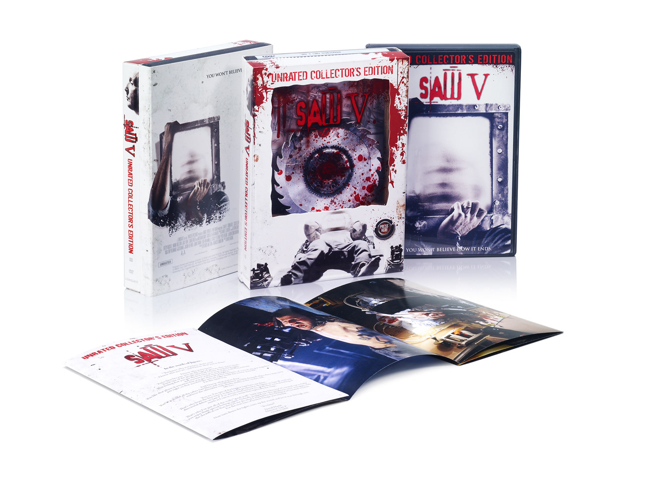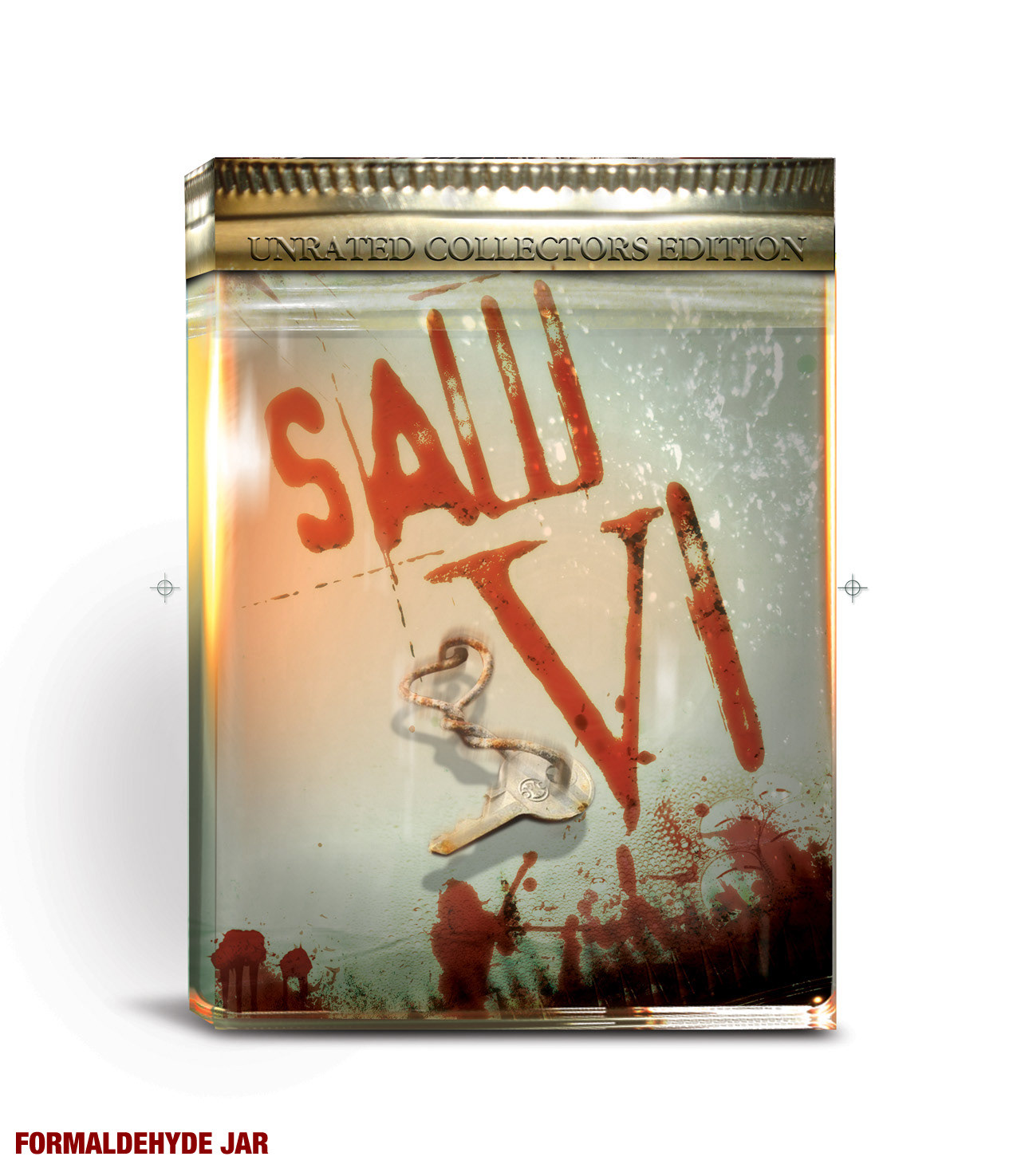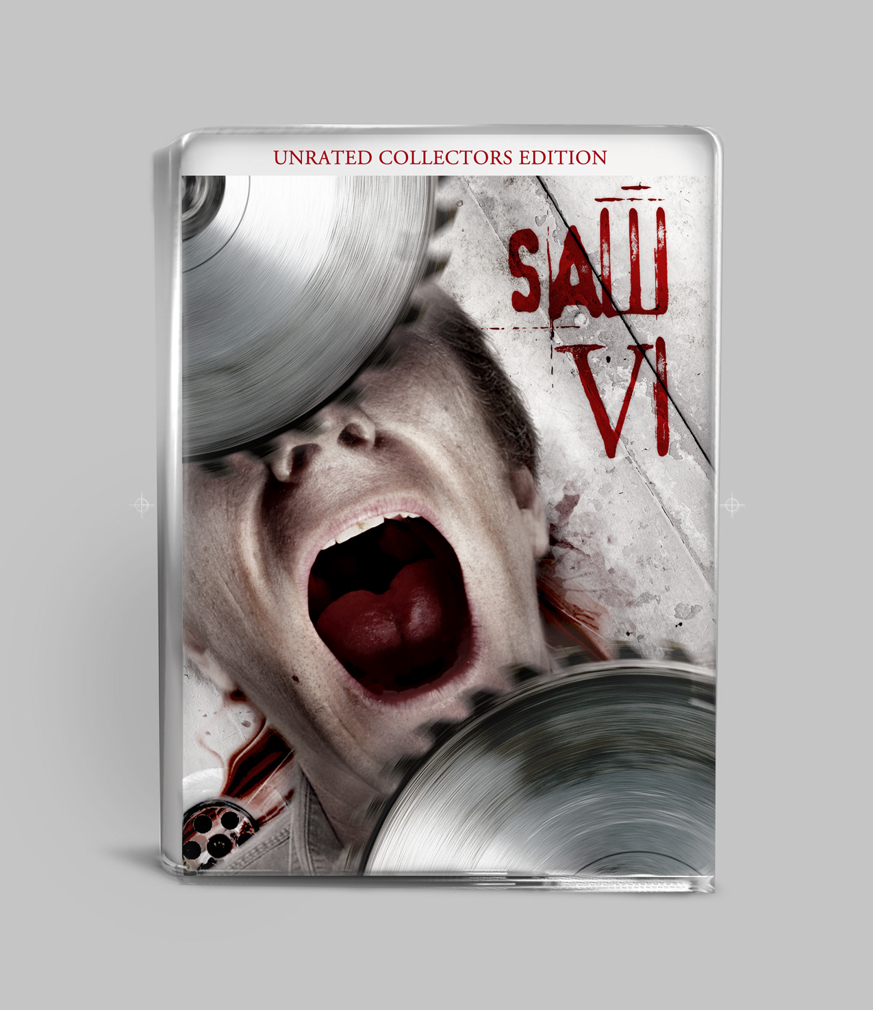 The DVD or Blu-ray disc(s) feature custom artwork, emphasizing an the look and feel of one of the film's elaborate trap games with influence to DVD packaging art for Saw VI